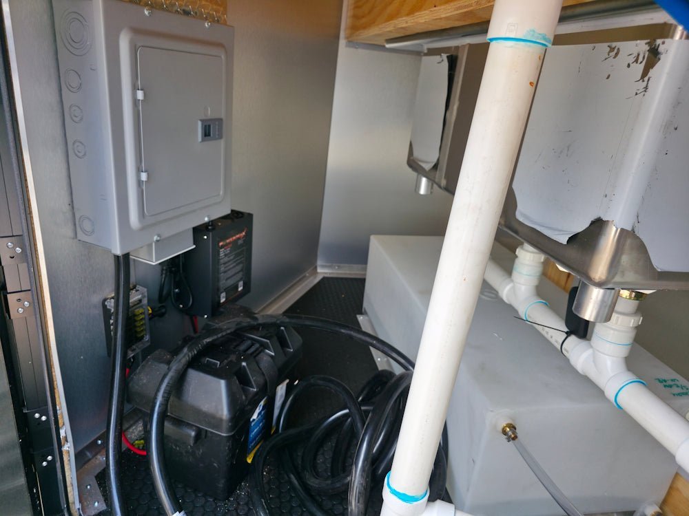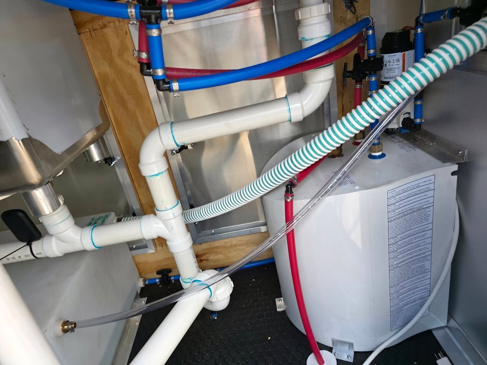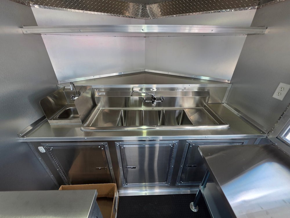 Complete Plumbing & Sink Package includes a three-compartment sink, hand wash station, 30-gallon fresh water tank, 50-gallon waste tank, 6-gallon water heater, and city water hookup.