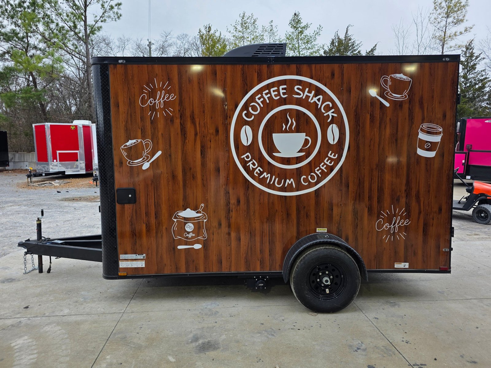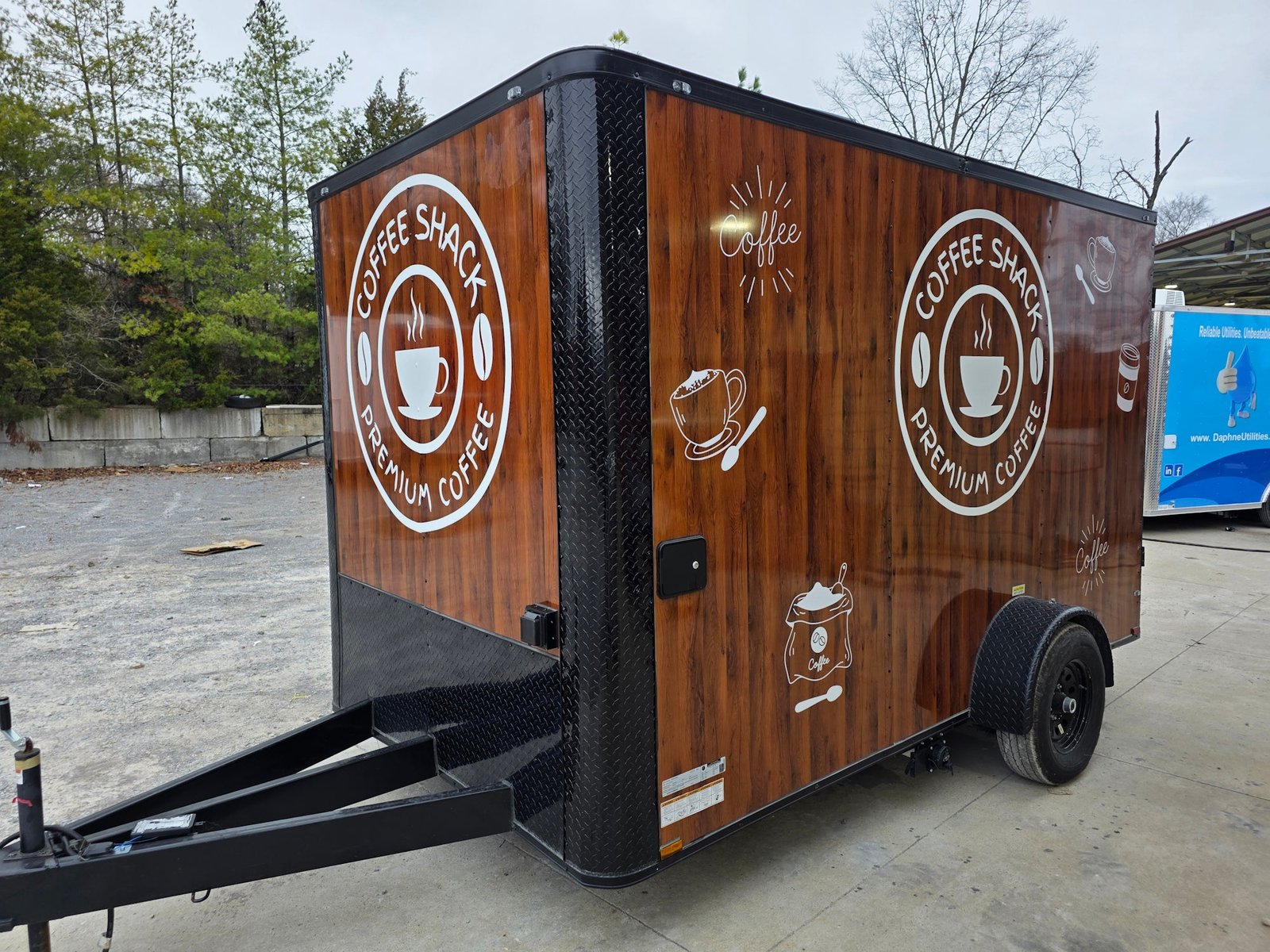 This coffee trailer is fully outfitted and ready to turn a profit immediately. It includes all professional graphics, appliances, and even the small wares (cups and creamer dispensers) — it’s a turnkey operation, ready to pull up and serve.