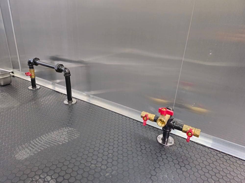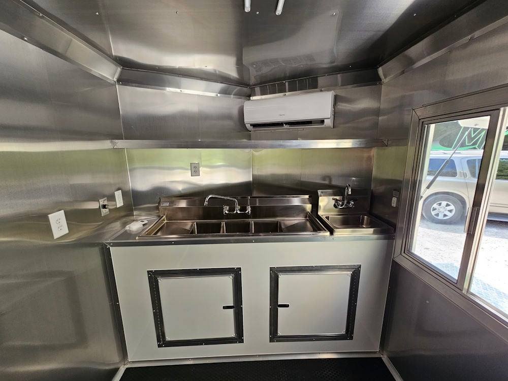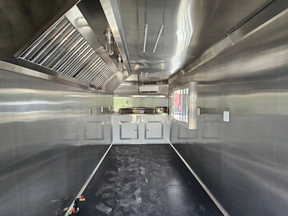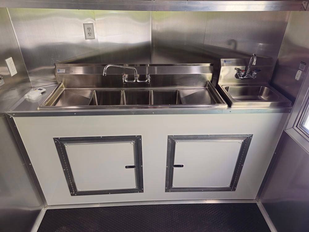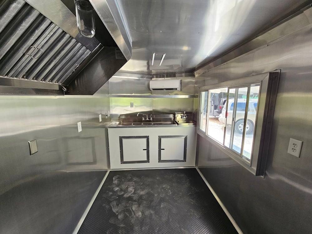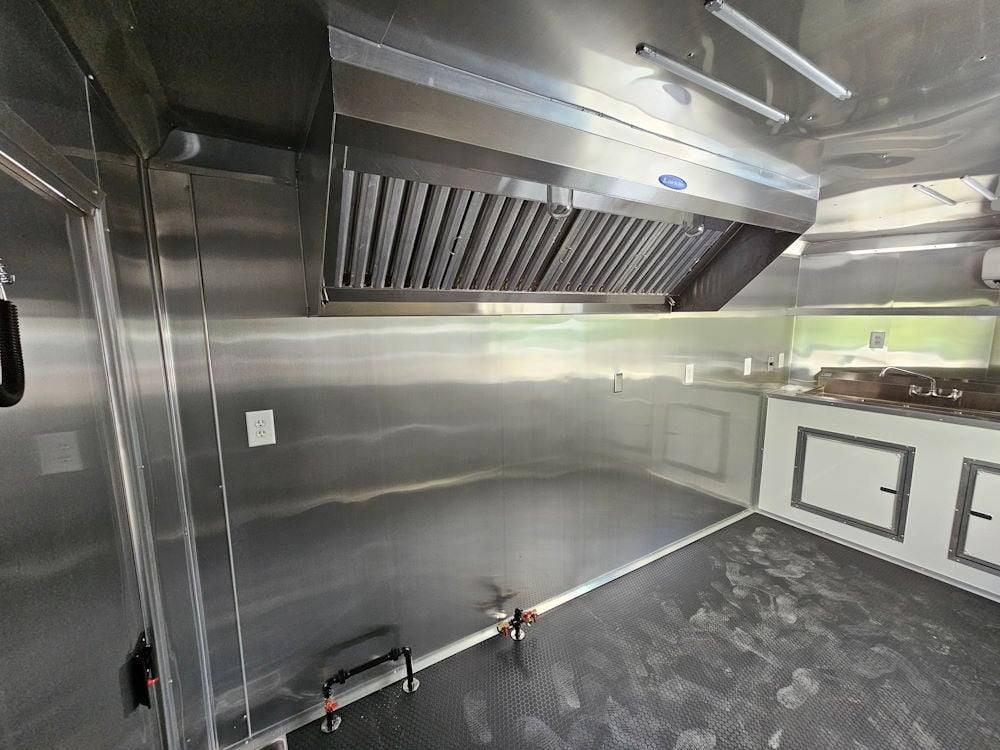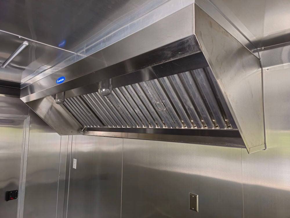 • 7′ Larkin Commercial Grease Hood: High-capacity ventilation system designed to handle commercial cooking demands and maintain proper airflow inside the trailer.