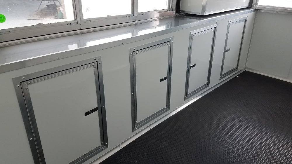 Convenient Service Windows: Rear 4′ plexiglass concession window and 6′ passenger side window with screens and flip-up counter allow smooth, professional customer service.