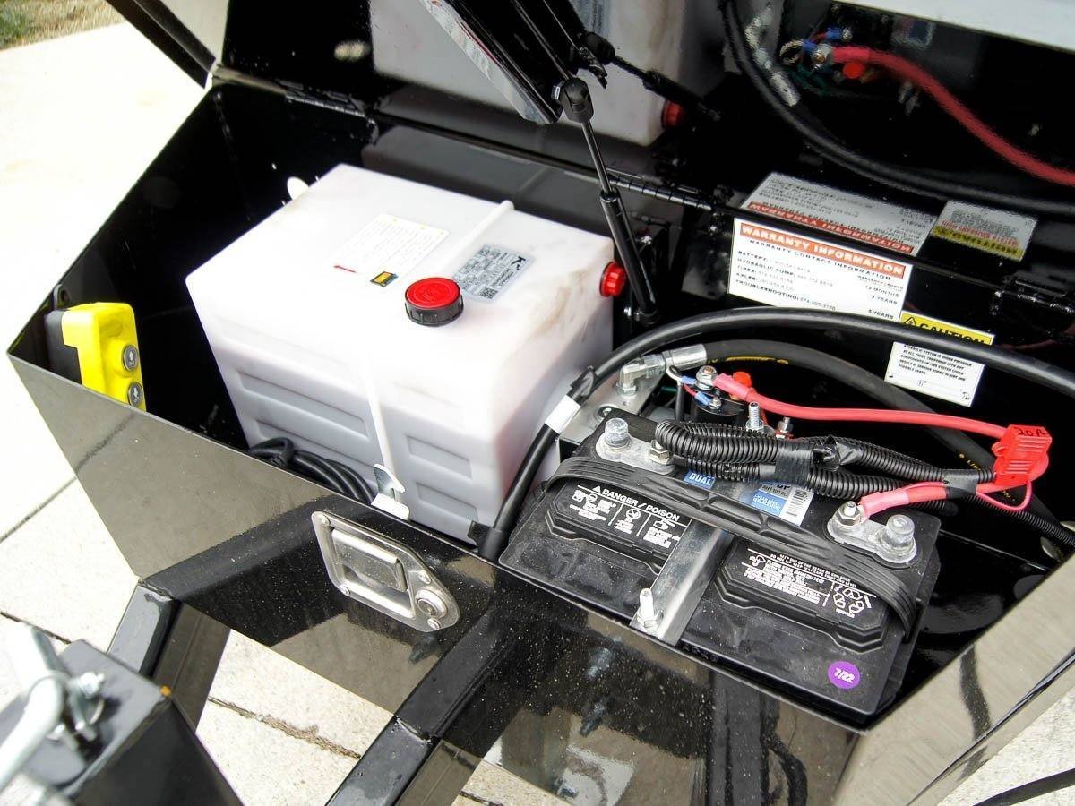 - The battery is an Interstate deep cycle marine battery, providing a dependable power supply for the trailer’s hydraulic system.