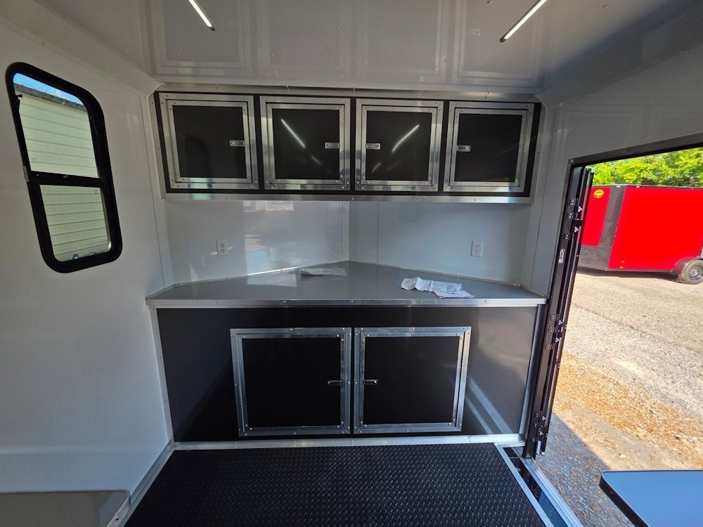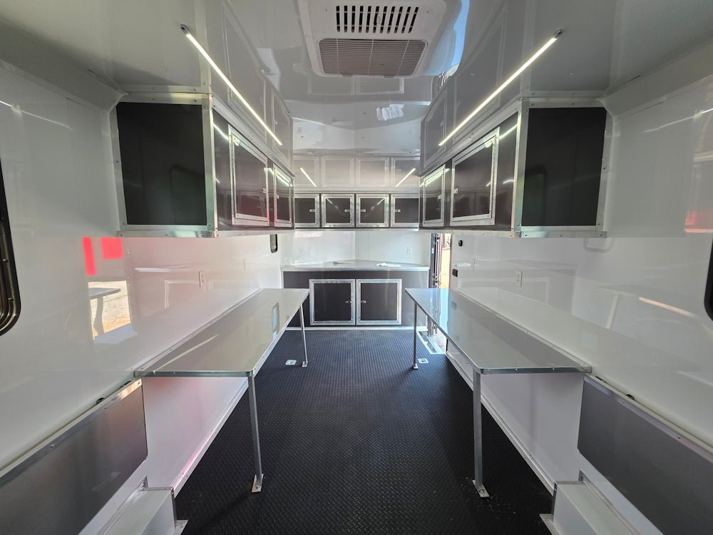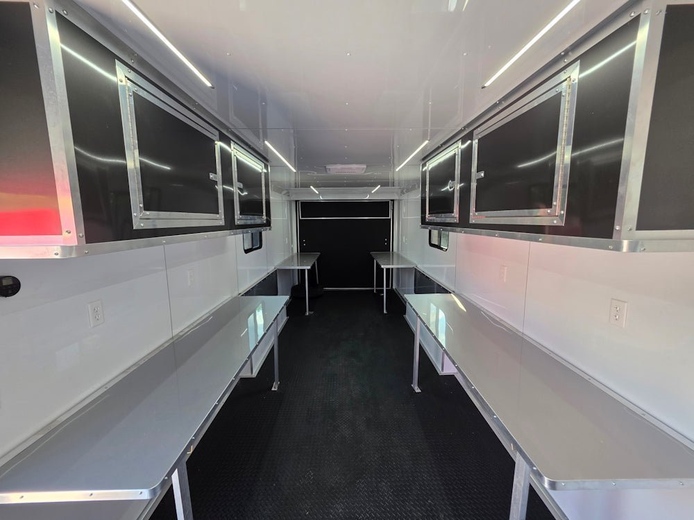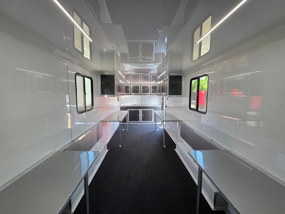 39′ 4″ of fold-down aluminum countertops – rugged, clean, and ideal for laptops, gear, or documentation