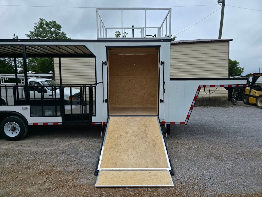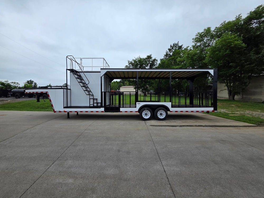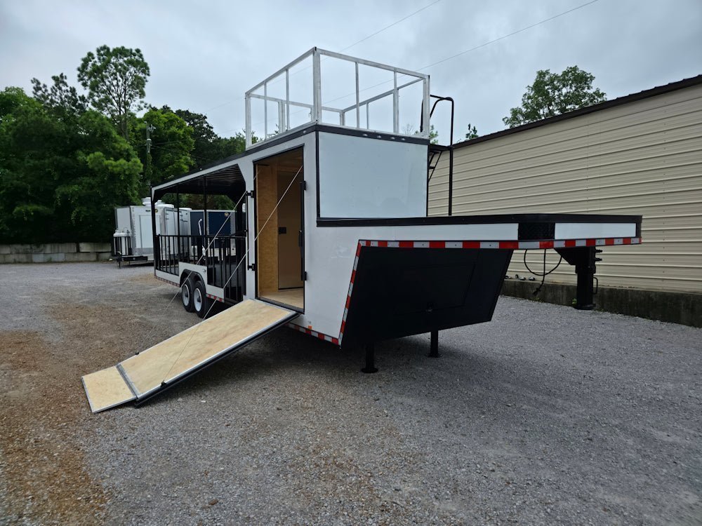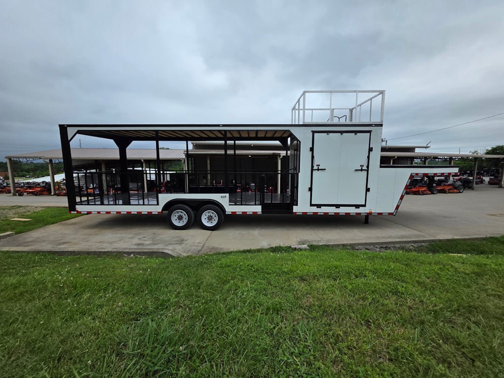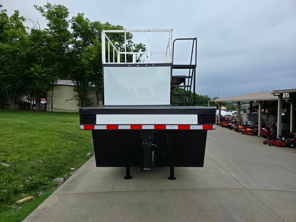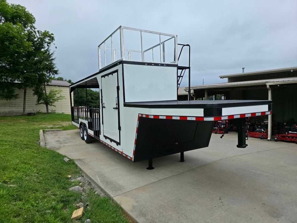 • Built on an elevated 8′ riser gooseneck platform, offering added deck space, improved towing stability, and increased visibility during transport.