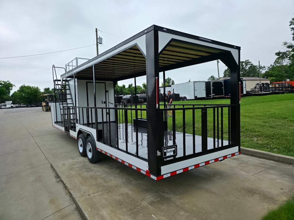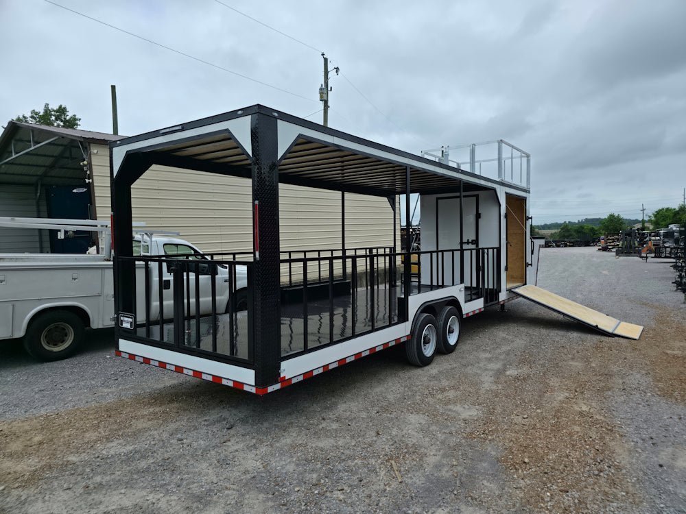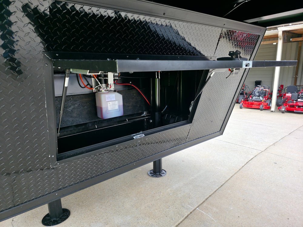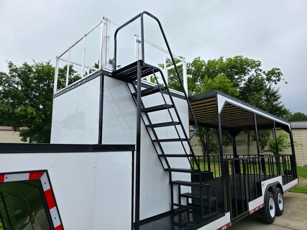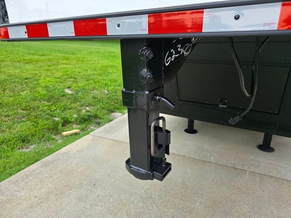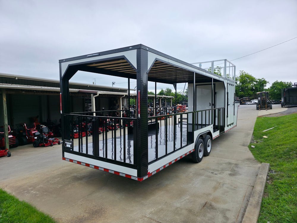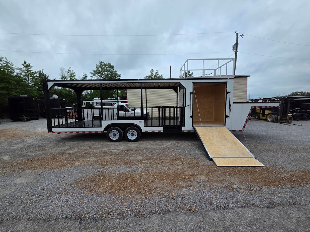 • Built on an elevated 8′ riser gooseneck platform, offering added deck space, improved towing stability, and increased visibility during transport.