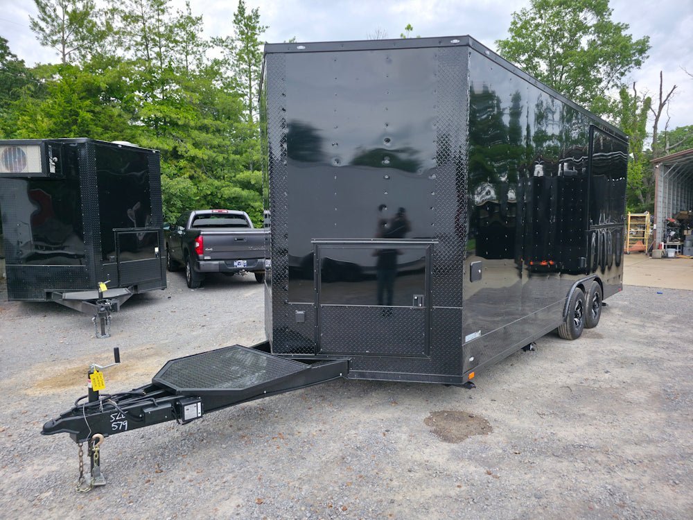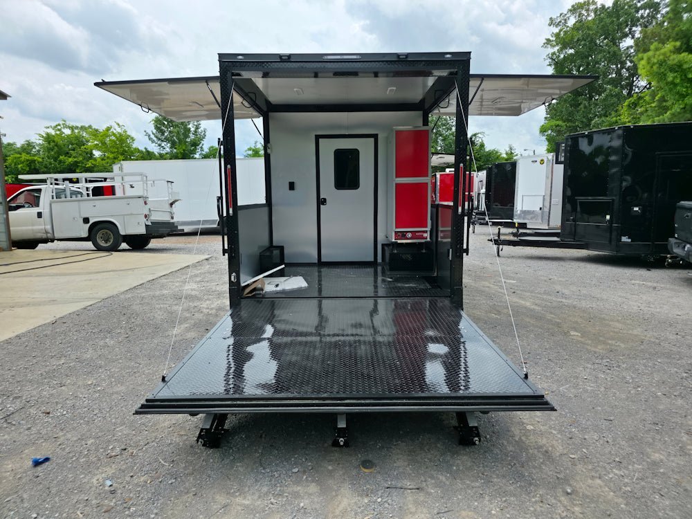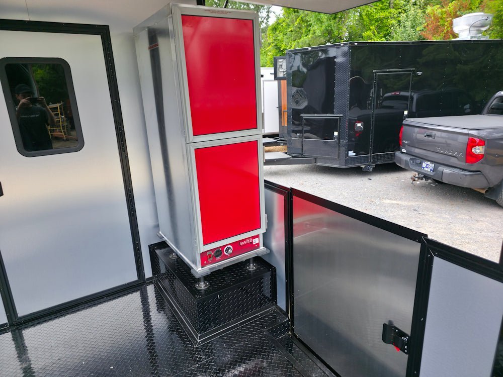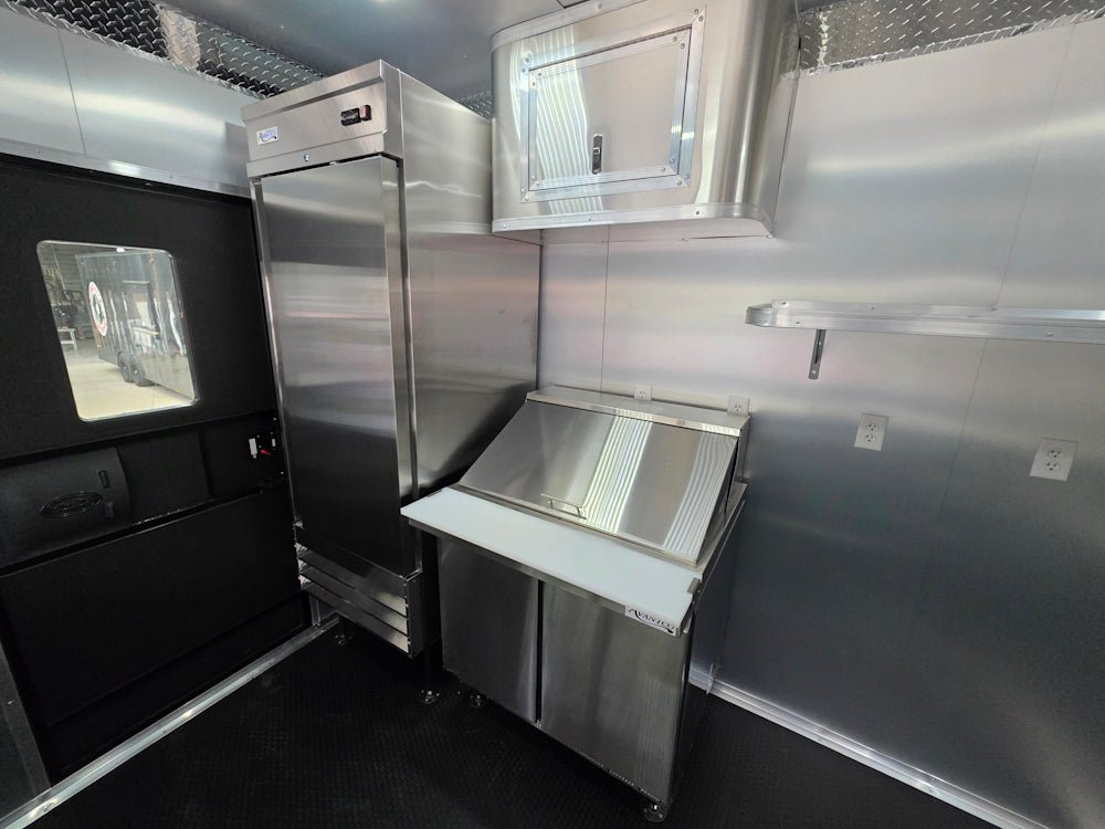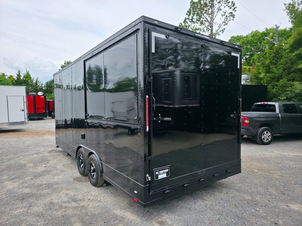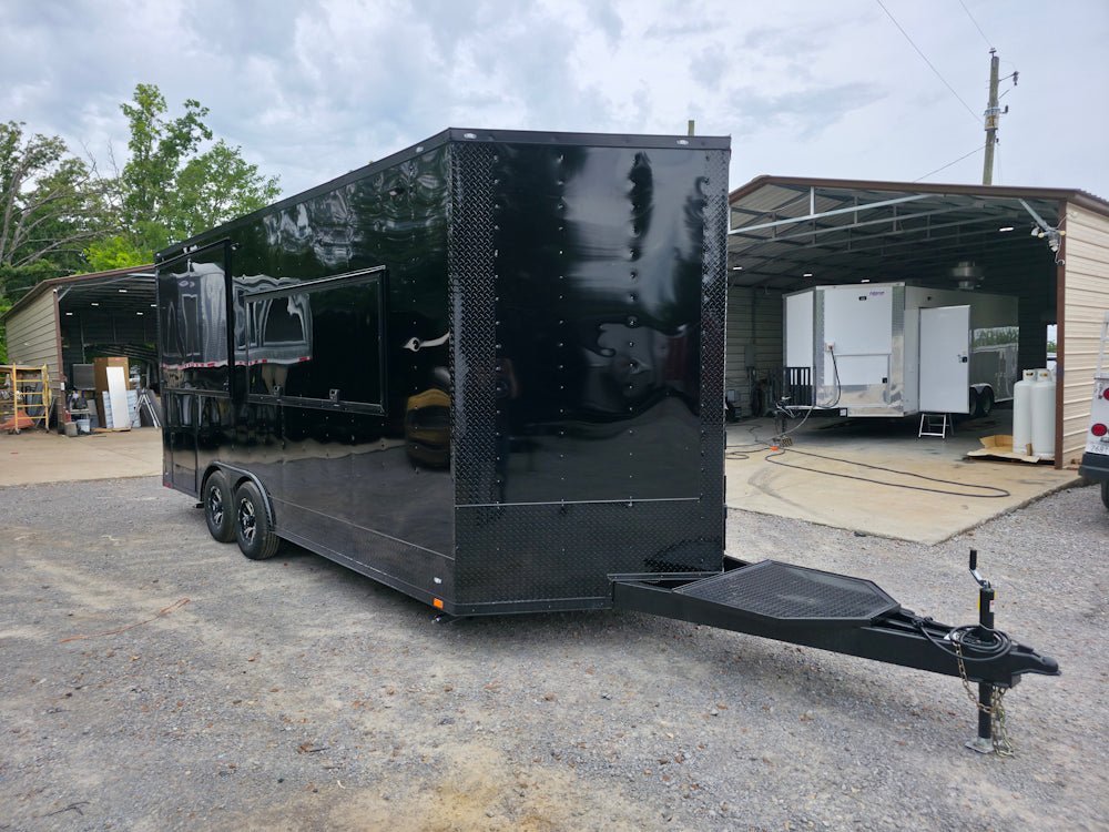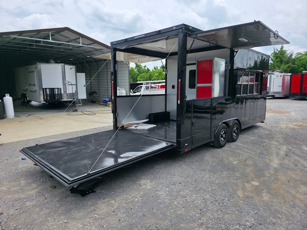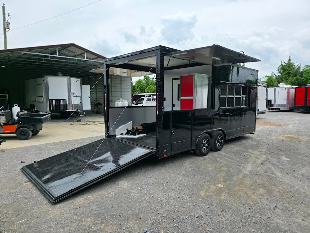 Spacious & Professional Design: Custom 8.5′ x 20′ black concession trailer with blackout trim, featuring a full 8′ interior height and integrated 8′ rear porch for high-traffic food service or mobile kitchens.