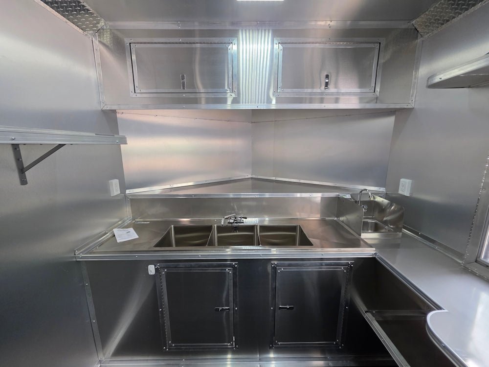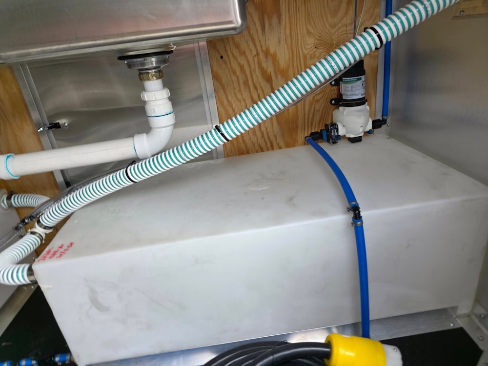 Water & Plumbing Package: Full sink setup with mop sink, work-top sink cover, 60-gallon fresh water, 80-gallon waste tank, 6-gallon water heater, and city water fill box for full on-site functionality.