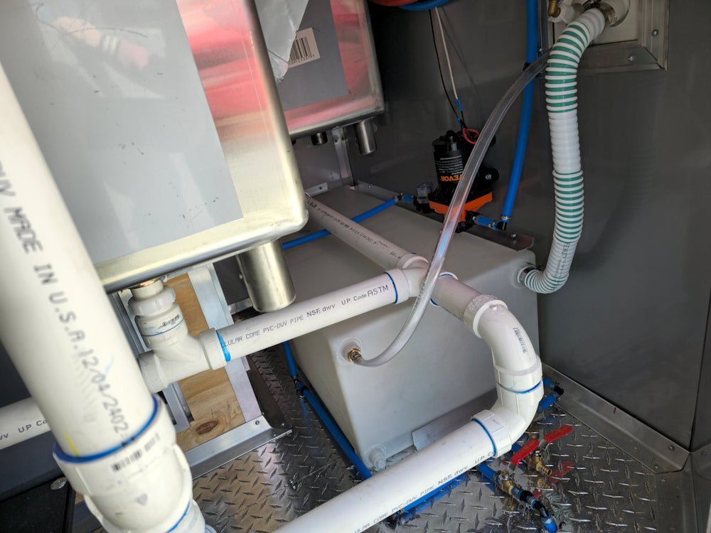 Plumbing & Hot Water – Sink package includes a dedicated vegetable sink, 30-gallon fresh water tank, 50-gallon waste tank, 6-gallon water heater, and city water fill box for convenience and compliance.