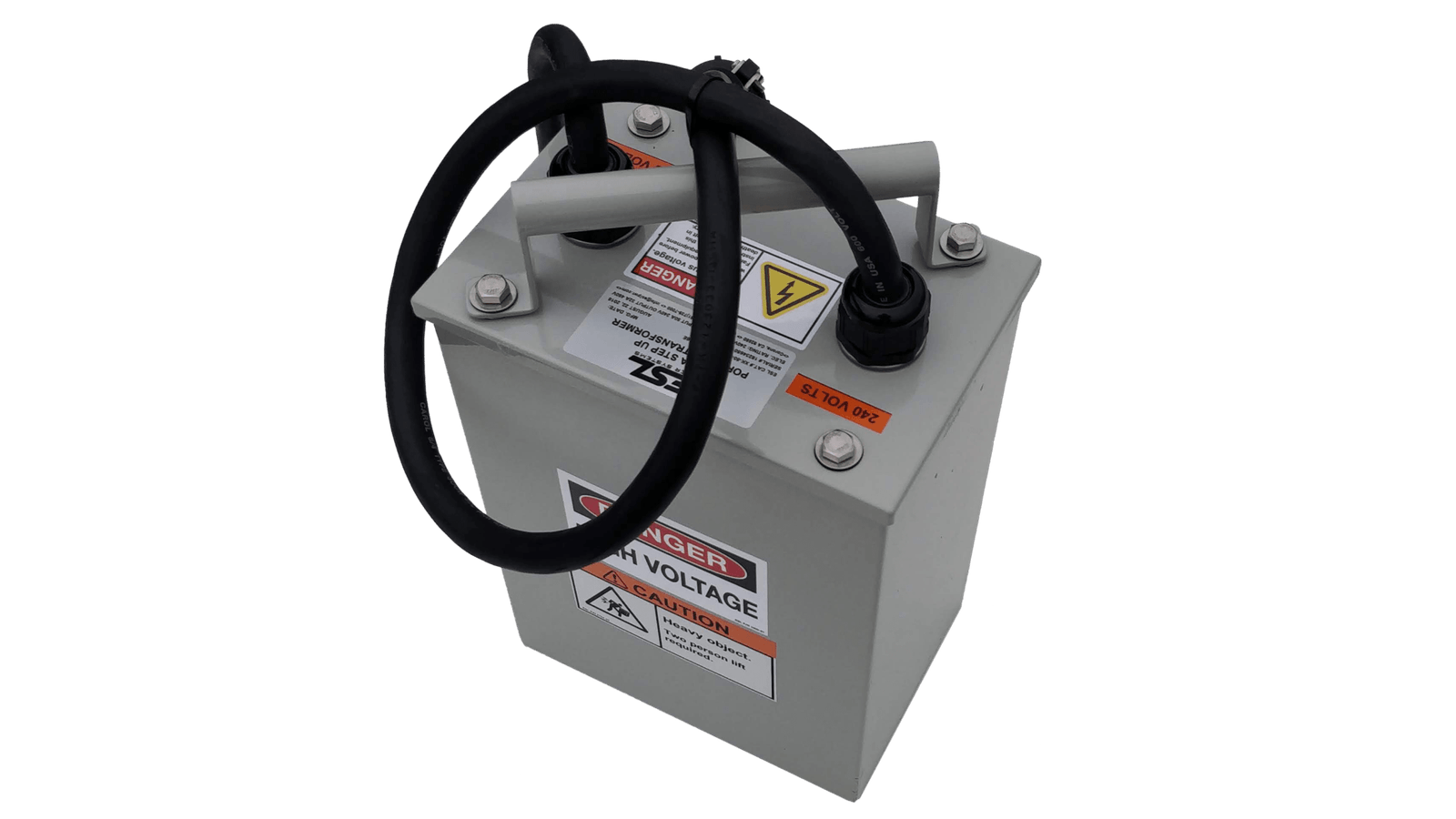 Each modular transformer includes an 8/4 SO cable with black 60˚ C (140˚ F) rated rubber insulation. The dual-voltage transformer is mounted to a plate/bracket, with an optional circuit breaker and high-voltage receptacle attached. The standard receptacle conforms to the CEE-17 design.
